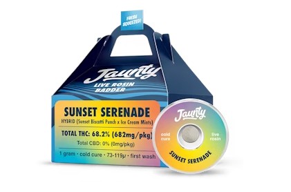 Hybrid (Sunset Biscotti Punch x Ice Cream Mints)Jaunty’s Cold Cure Badder is a 100% solventless extract made from freshly harvested, flash-frozen cannabis flower. Using only ice and water, we create single-sourced ice water hash, screened at 73-119 microns. Our live rosin is then slow-cured at 65°-70°, resulting in a smooth, buttery consistency that preserves the full spectrum of terpenes, cannabinoids, and flavonoids. Tasting Notes: candy, sweet, fruity Primary Terpenes: Carophyllene, Limonene, Myrcene