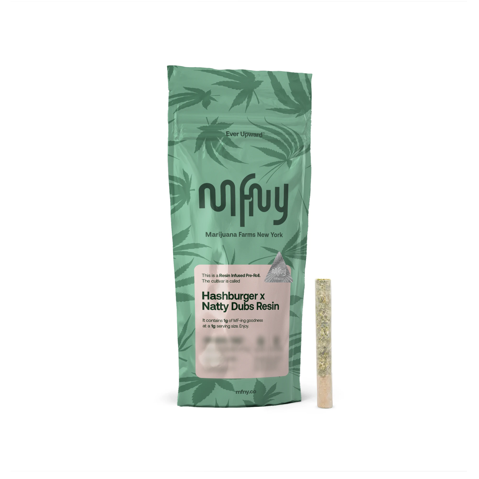 For our resin infused pre-rolls, we start with premium, hand-trimmed whole Hash Burger flower then infuse it with our in-house made Natty Dubs live resin HTFSE (High Terpene Full Spectrum Extract from fresh frozen buds). This process creates a higher potency, flavorful product with the best of two cultivars: enhanced sweet, spicy, and woody aromas of the Hash Burger cultivar, paired with the termafirma and gasoline aromas and flavors of the Natty Dubs cultivar. Potent and high in THC, this product is a treat for experienced cannabis consumers. No shake, no trim. Just the very best of our craft cannabis, ready to enjoy. Exclusively single-sourced at MFNY in the Hudson Valley