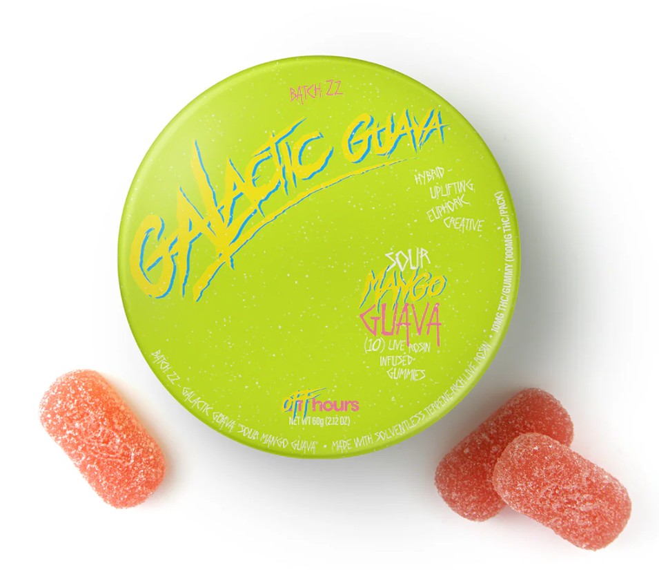 BLAST OFF WITH OFF HOURS “GALACTIC GUAVA” LIVE ROSIN GUMMIES. A TANGY MIX OF SOUR MANGO AND GUAVA DELIVERS TROPICAL SWEETNESS WITH AN UPLIFTING, EUPHORIC HIGH THAT SPARKS CREATIVITY AND COLOR.