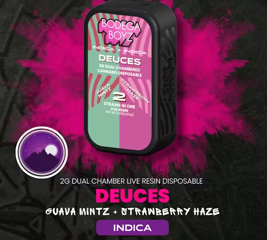 Introducing our ultimate relaxation combo: Guava Mintz and Strawberry Haze, perfectly paired for your chill sessions in our Deuces dual-chamber tank. Guava Mintz offers a cool oasis of flavor with its soothing blend of tropical guava and refreshing mint, while Strawberry Haze delivers a delightful fusion of ripe strawberries and a hint of haze, adding sweetness to your relaxation routine. Both strains boast the calming effects of indica varieties, ideal for melting away stress and promoting tranquility. Whether unwinding after a long day or seeking a moment of calm, our Guava Mintz and Strawberry Haze combo has you covered. Experience the flexibility to enjoy each flavor individually or mix them for an unparalleled taste adventure. Tap once to switch seamlessly between flavors, or double-tap for a unique fusion that dances on your palate. Experience the flexibility to enjoy each flavor individually or mix them for an unparalleled taste adventure. Elevate your vaping journey with this dynamic trio - because why settle for two flavors when you can savor three?