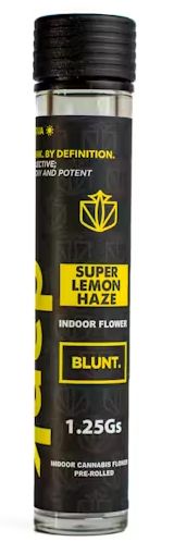 A 1.25 gram pre-roll blunt of premium DANK Super Lemon Haze Flower rolled in a fresh hemp wrap with a glass tip.