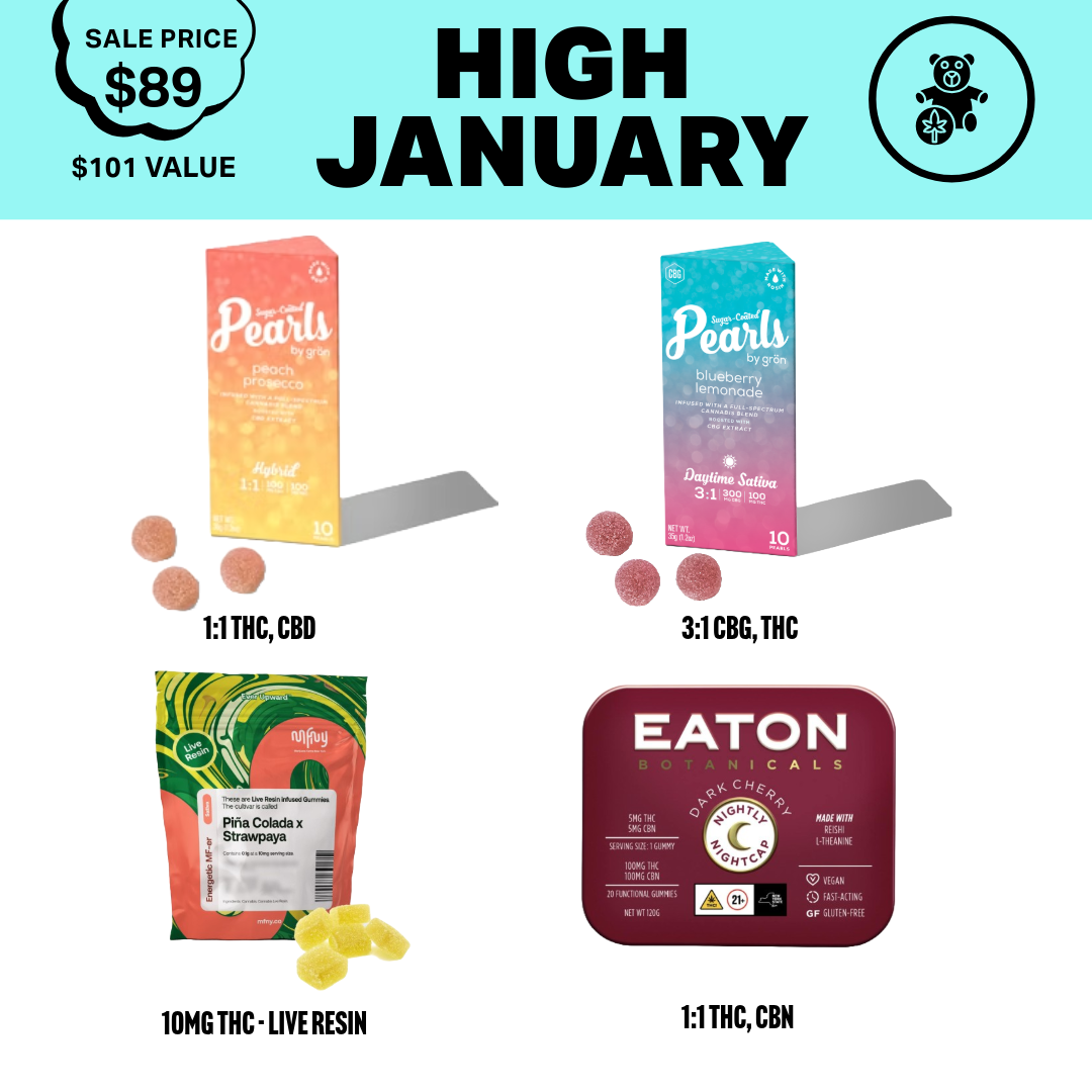 Trying out Dry January this year? Try High January instead! This bundle of edibles contains all your usual ritual needs. Peach Prosecco pearls from Gron for when you want to feel bubbly. Blueberry Lemonade Pearls from Gron are a perfect replacement for your mimosa with brunch. Looking for a nightcap? Look no further than Nightly Cherry Chews from Eaton. Finally, enjoy a bit of a tropical vacation with MFNY's Pina Colada gummies.