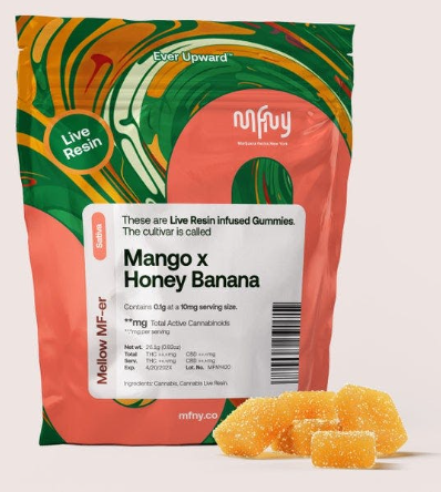 Terpene-rich edibles at an even tastier price. Introducing our live resin Mango x Honey Banana gummies. These vegan gummies are infused with MFNY’s single-source, in-house produced Honey Banana live resin. We start with fresh-frozen flower buds, then use the hydrocarbon extraction method (plus years of experience and scientific precision) to deliver the purest plant extract. An extract that showcases the cultivar's naturally-produced, full-spectrum cannabinoids and remarkable natural terpenes. Honey Banana is known for its flavors of strawberry, banana, and sweet honey. To complement the Honey Banana cultivar, we add the minimum amount of sugar, plus mango flavors.