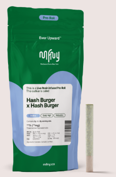 For our resin infused pre-rolls, we start with premium, hand-trimmed whole Hash Burger flower then infuse it with our in-house made Hash Burger live resin HTFSE (High Terpene Full Spectrum Extract from fresh frozen buds) totaling three quarters of a gram in weight. This process creates a higher potency, flavorful product, as Hash Burger recalls flavors of sweet yet spicy lemon, finished off by woody pine and fresh flower notes. Potent and high in THC, this product is a treat for experienced cannabis consumers. No shake, no trim. Just the very best of our craft cannabis, ready to enjoy. Exclusively single-sourced at MFNY in the Hudson Valley